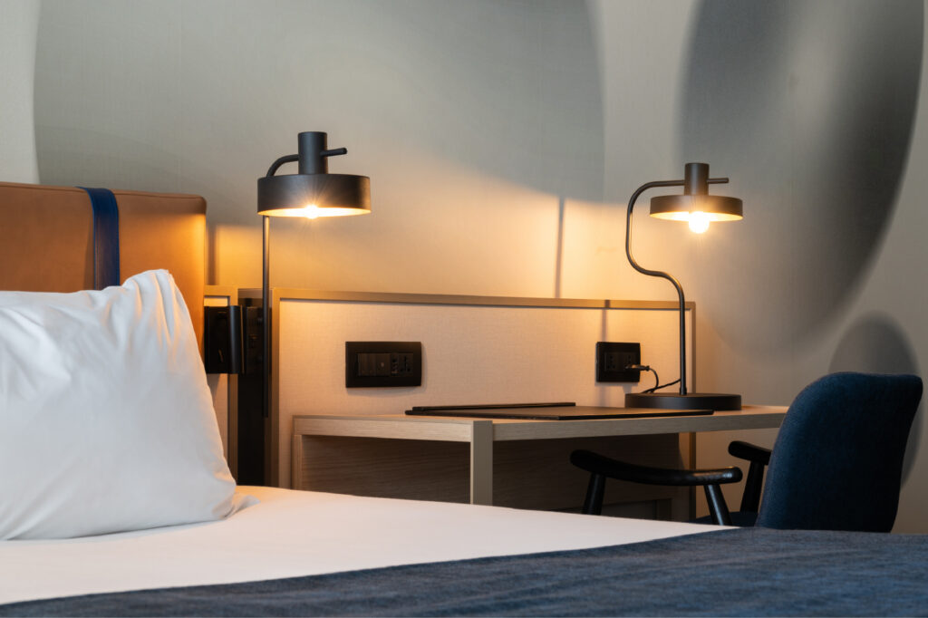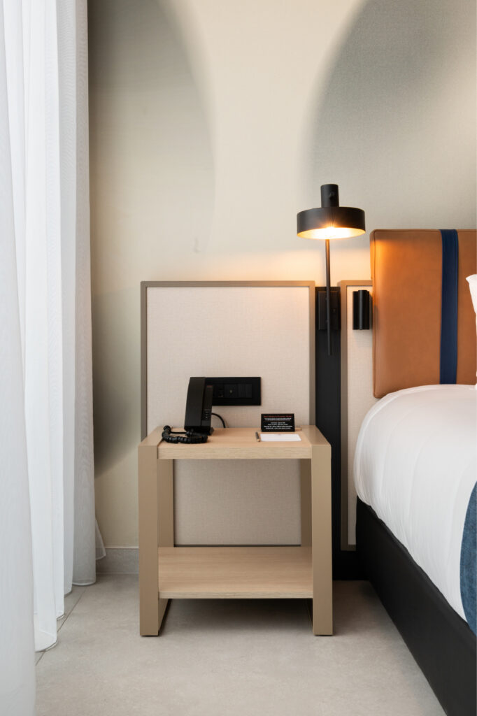 Our scope encompassed bespoke furniture solutions combining metal and laminated wood panels with upholstered headboards and bed bases, balancing durability, design integrity, and operational efficiency. Additional elements included bedside tables, desks, night tables, shelves, benches, mirrors, wardrobes, and luggage racks, all designed to meet the exacting standards of modern hospitality interiors.