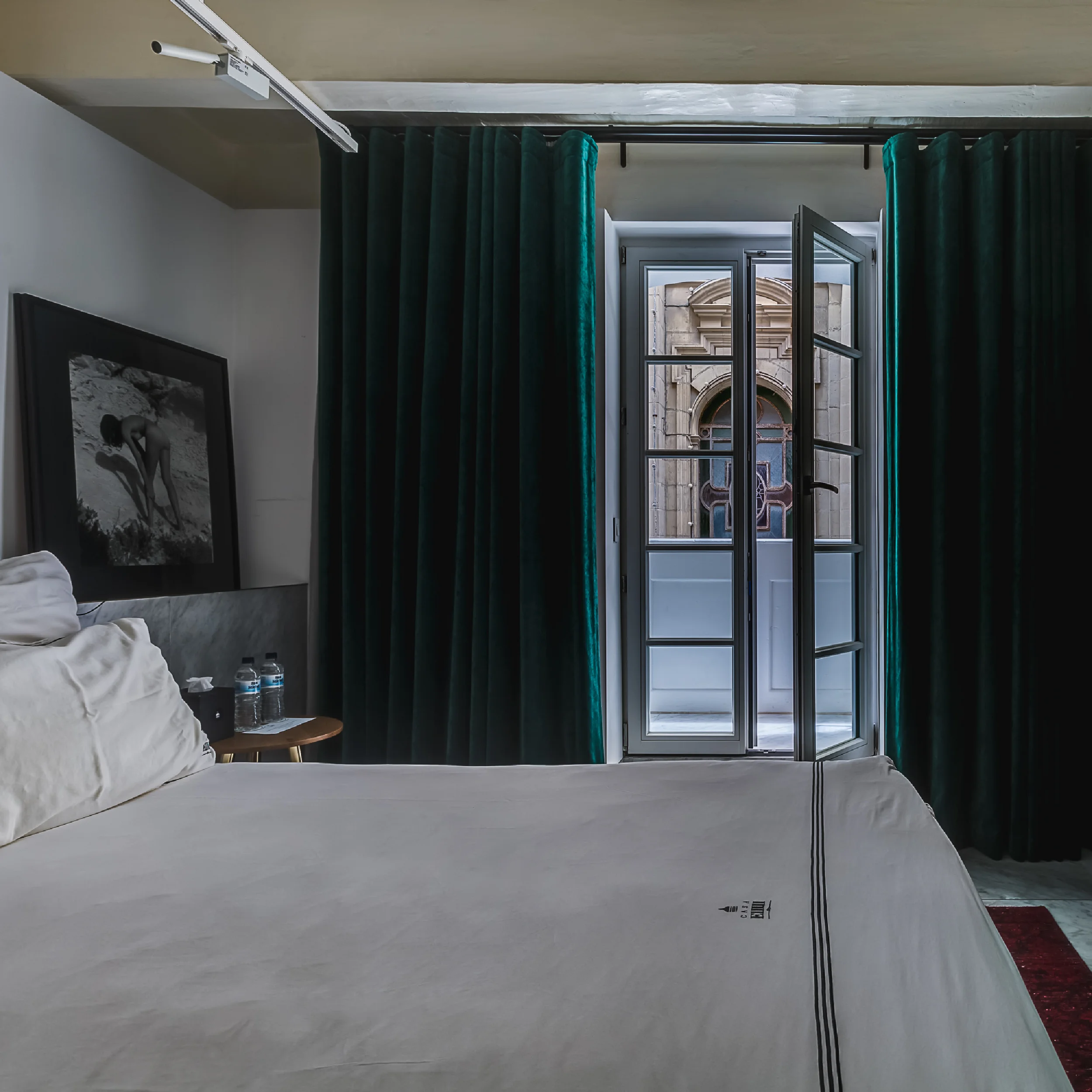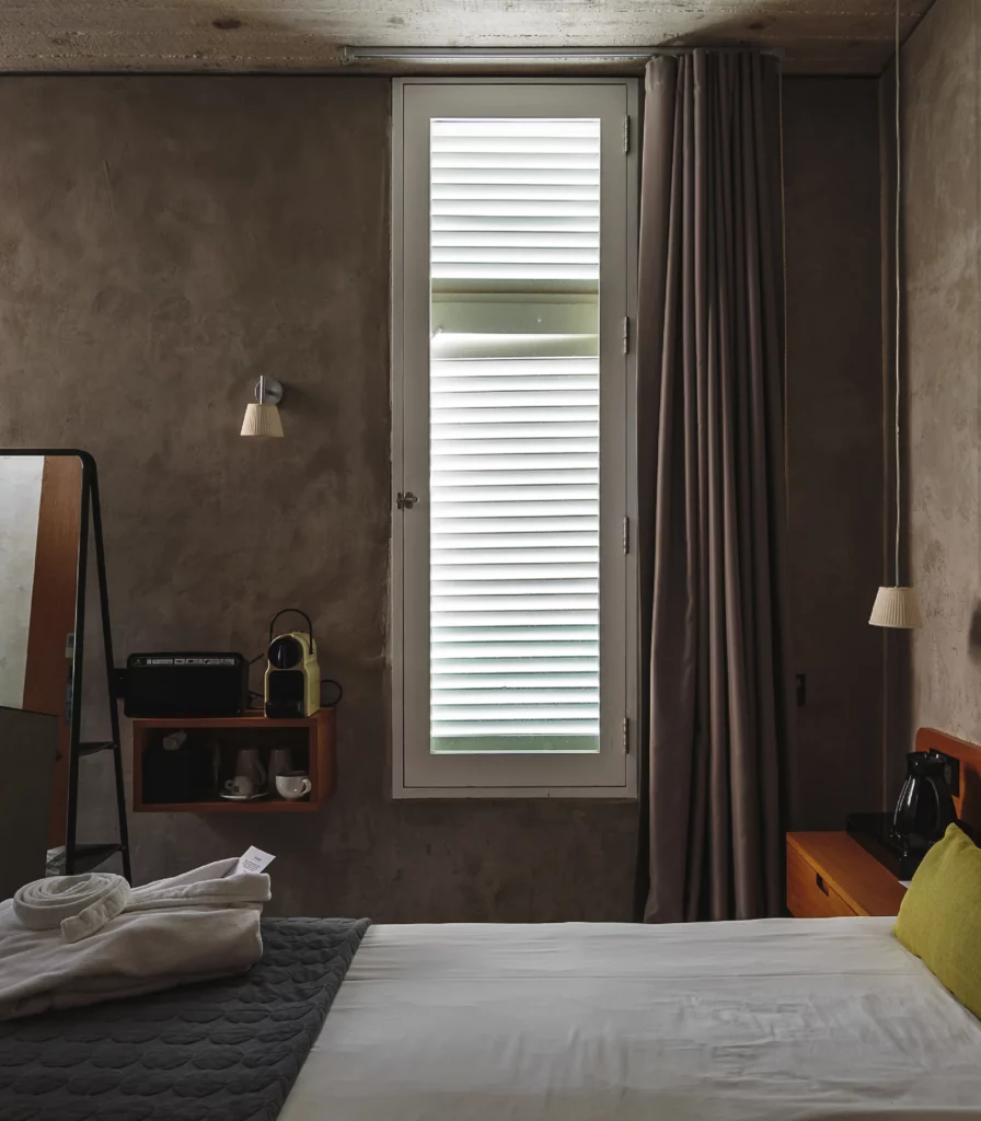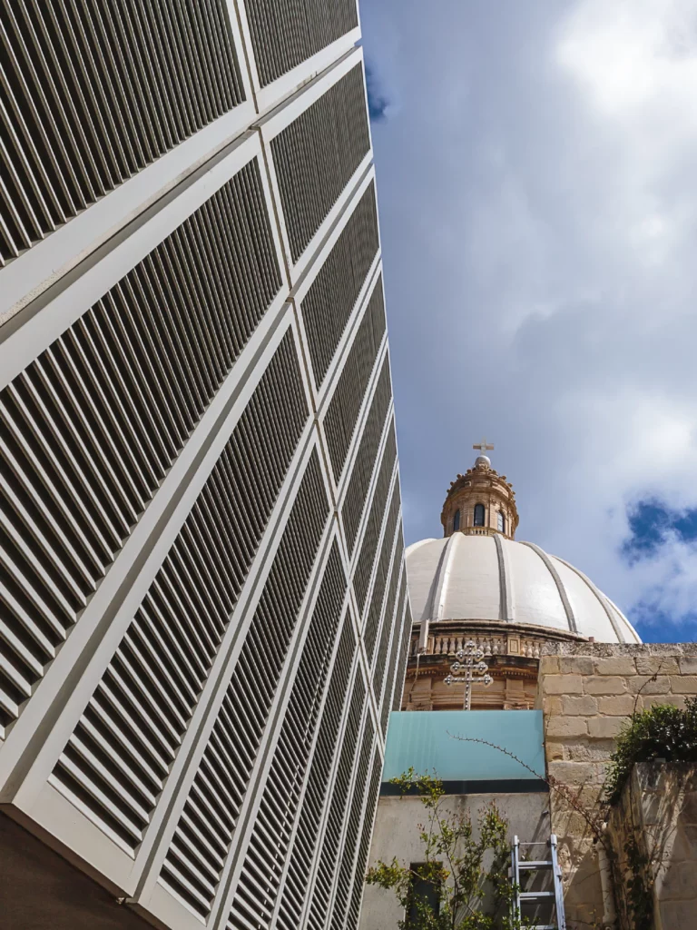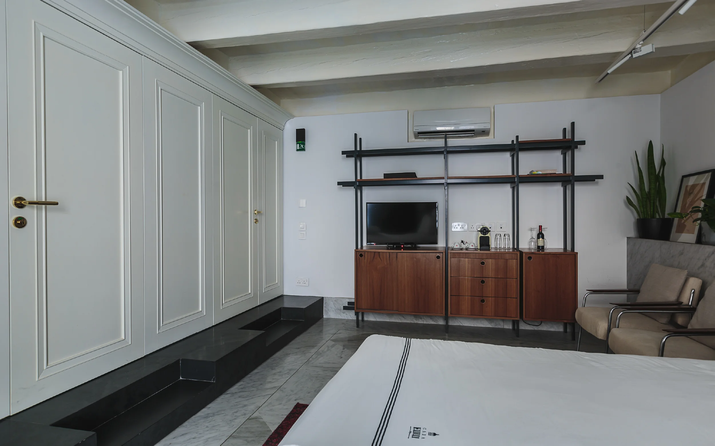 While retaining most of the original architectural fabric and keeping alterations to a minimum, the rooftop extension was conceived as a distinctive louvred ‘hat’, inspired by traditional Maltese persjani. This architectural feature wraps around the top suites, acting both as a visual screen and as a functional enclosure for outdoor services, seamlessly blending heritage references with contemporary design.