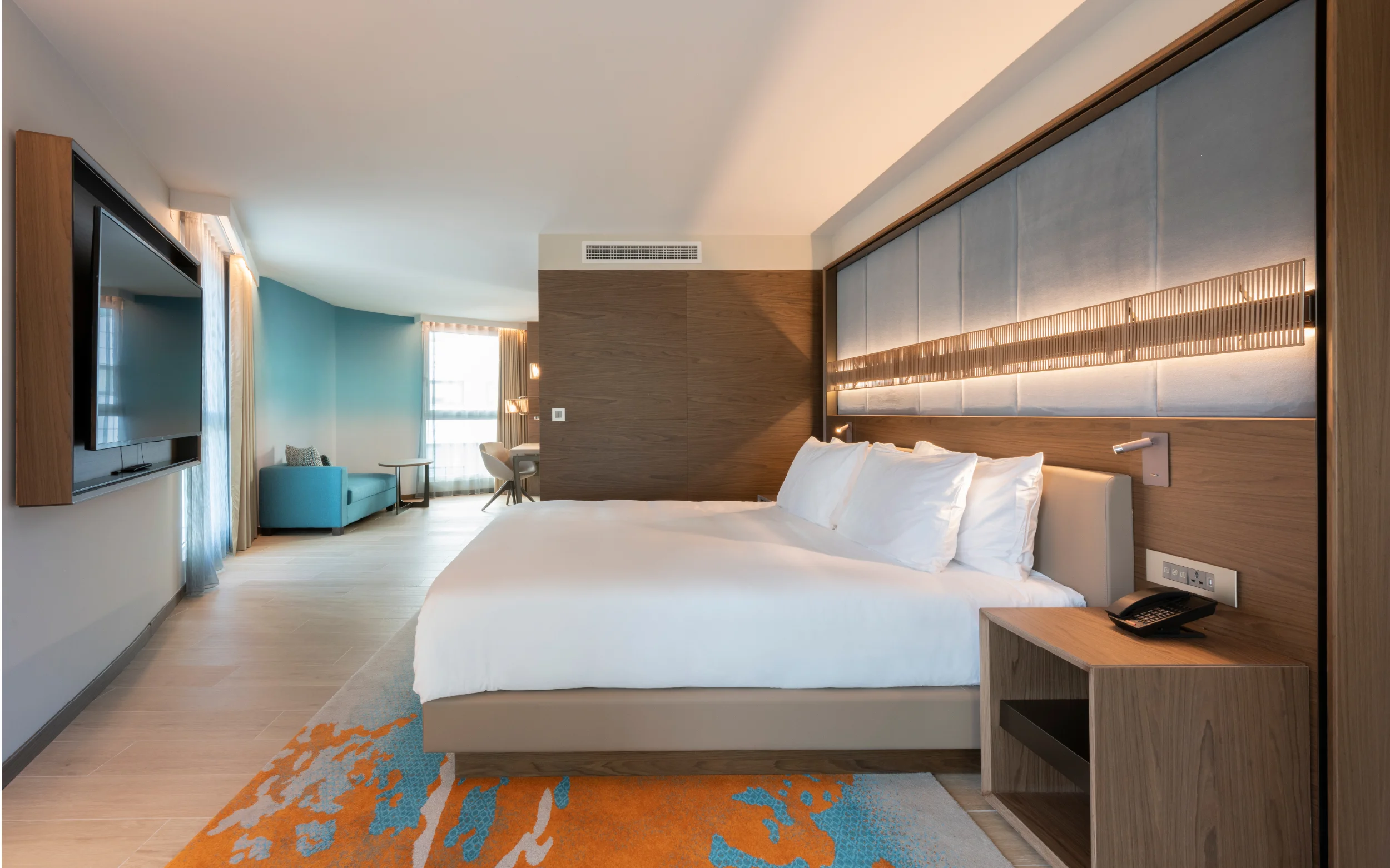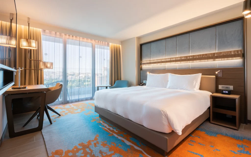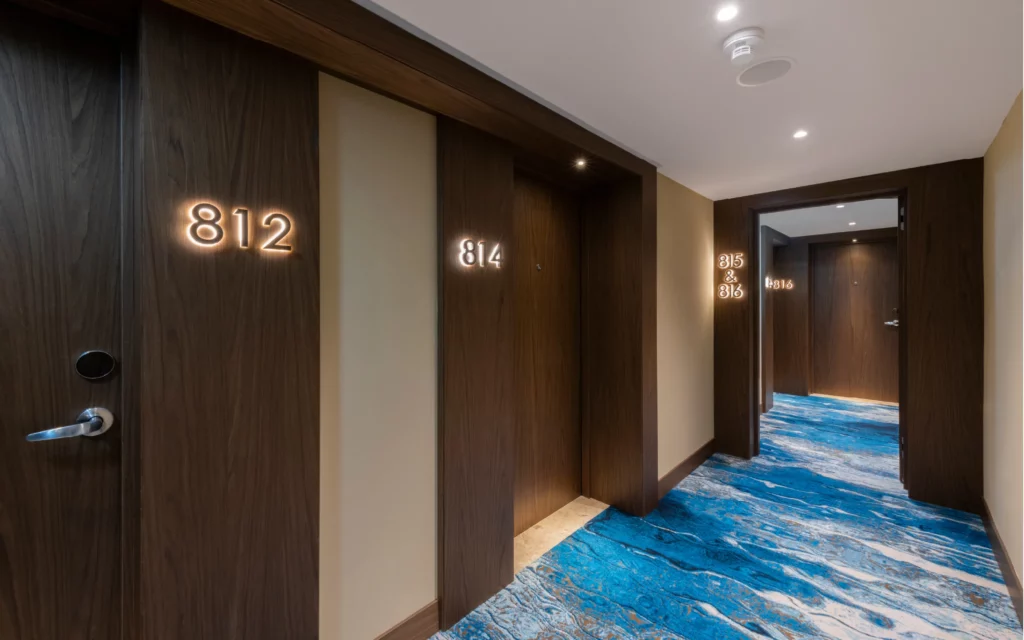 The scope covered both guestroom and public area fit-outs, encompassing every interior element from doors to bespoke furniture. Throughout the hotel, SAW installed an extensive range of high-performance doors, including 42 dB acoustic models for guestrooms, 30-, 60-, and 120-minute fire-rated doors, and standard internal variants all tailored to meet the operational and safety requirements of a high-occupancy environment.