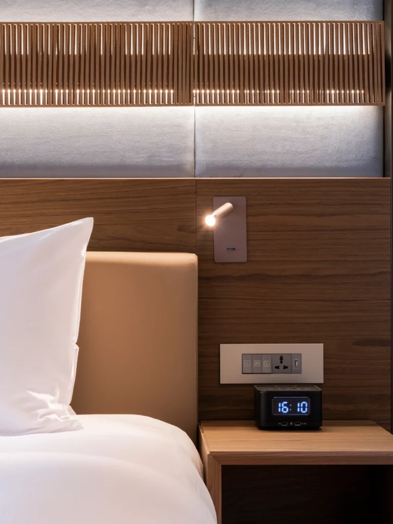 In the 151 guestrooms, the team produced and installed a complete suite of custom furniture, balancing function with refined aesthetics. Each piece from sofa beds and bedside tables to wardrobes, vanities, and chairs was meticulously crafted using a blend of veneer and metal finishes. SAW also designed bespoke light fittings, combining leather and metal for a distinct visual signature, and oversaw the production of custom-made wallpaper to achieve a cohesive interior identity.