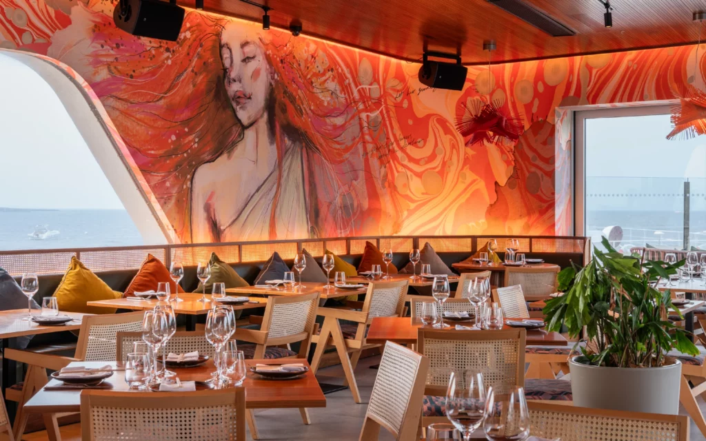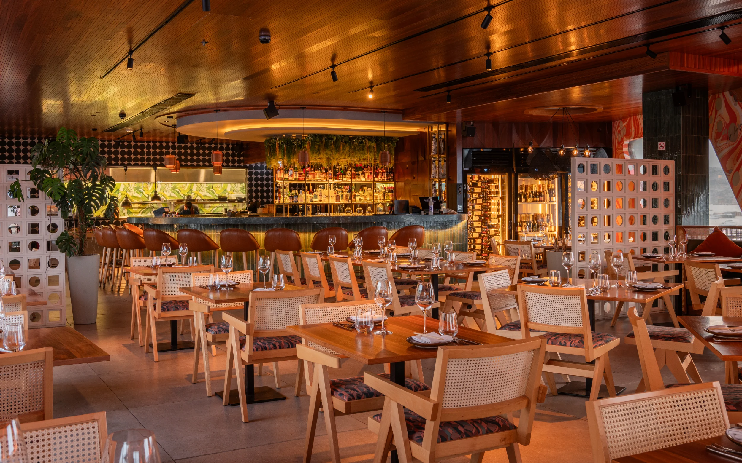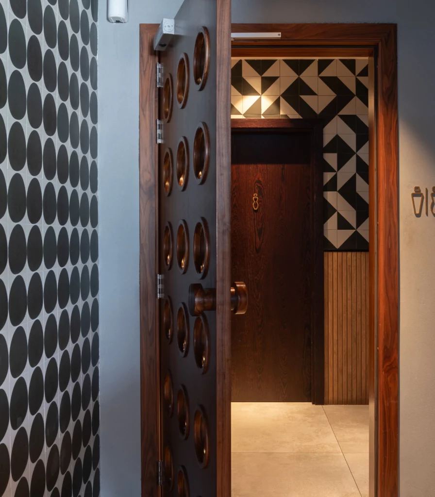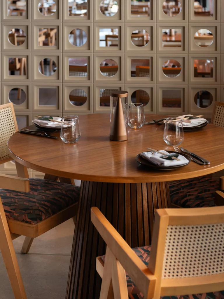 The scope of works included customised internal doors and a complete fit-out of the U-shaped main bar, terrace bar, and outdoor waiter station, designed for both operational efficiency and striking visual impact. SAW also produced banquet seating benches, dining tables, coffee tables, host stands, cabinets, and bathroom vanity units, all manufactured to exacting standards to meet the high expectations of the design team.