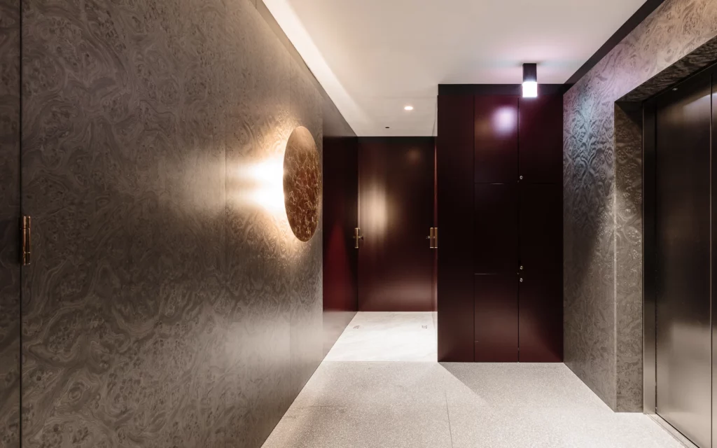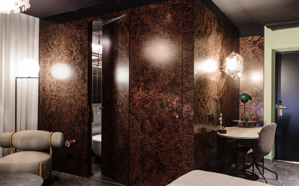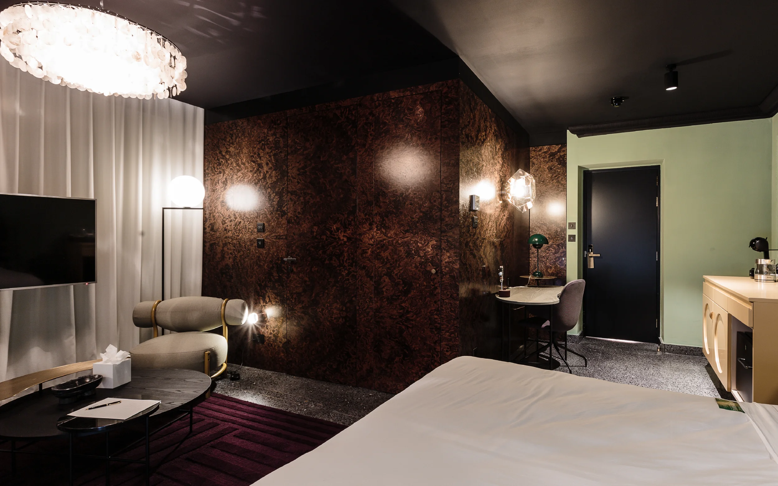Across both private rooms and public areas, the design language is unified through composite marble flooring, intricate wood panelling, and hand-crafted brass inlays, elements that extend seamlessly throughout the hotel. These rich material foundations are elevated with geometric textiles and modern patterns, adding depth and visual rhythm to the interiors. The spaces are completed with carefully selected designer furniture, reworking classic design icons through a contemporary lens and reinforcing the project’s emphasis on craftsmanship and detail.