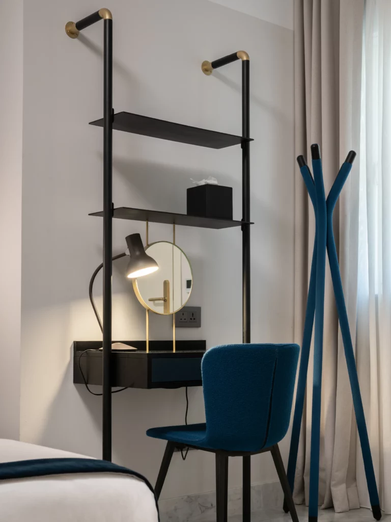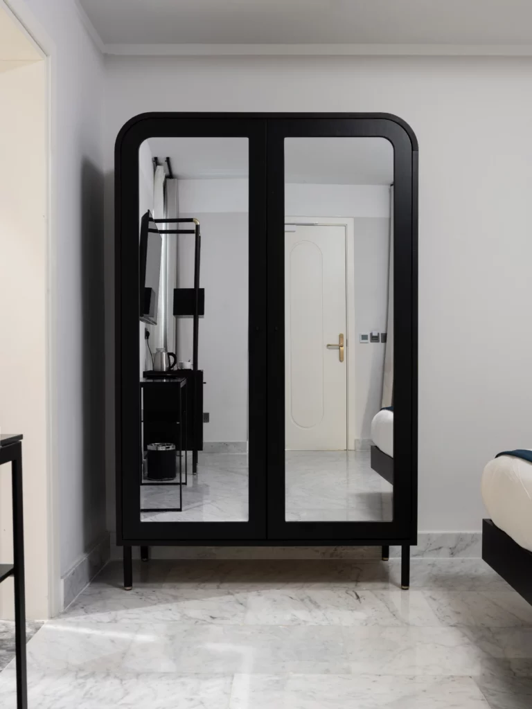The scope of works encompassed 31 guest rooms, along with 58 internal doors, 110 external apertures, 15 internal windows, and a balcony unit, each designed and manufactured to align with the building’s architectural context. Beyond the guestrooms, SAW delivered bespoke joinery for the reception desk and wall panelling, waiter station, seating benches, and custom storage units, integrating both functional and aesthetic considerations across every element.