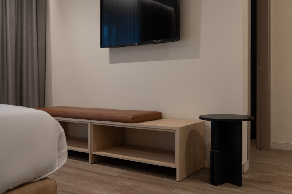 Our scope included 21 guest rooms outfitted with custom furniture, fire-rated guest room doors, and fully upholstered seating to enhance both comfort and design. Key public areas such as the reception and bar/cafeteria were also furnished with bespoke joinery, seating, chairs, and tables, incorporating integrated LED strip lighting to elevate the ambiance.